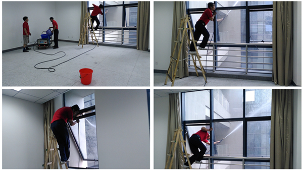 使用玻璃刮,抹水器,無泡玻璃水,強力清洗劑,徹底清除污垢,包括窗框清理,保護膜的清理,窗戶縫的清洗,對一些頑固的水泥點膠質可用玻璃鏟刀去除,藥水中有防靜電成分,經擦拭過的玻璃、窗框晶瑩光亮,不沾灰。